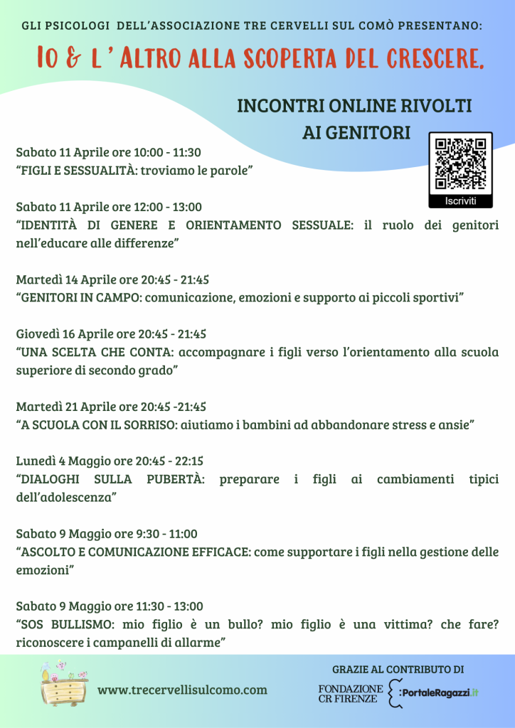 Grazie al contributo di Fondazione CR Firenze, sulla scia del progetto educativo “Io e l’ altro” ,l”Associazione Tre Cervelli sul comò propone un programma di incontri online per genitori.